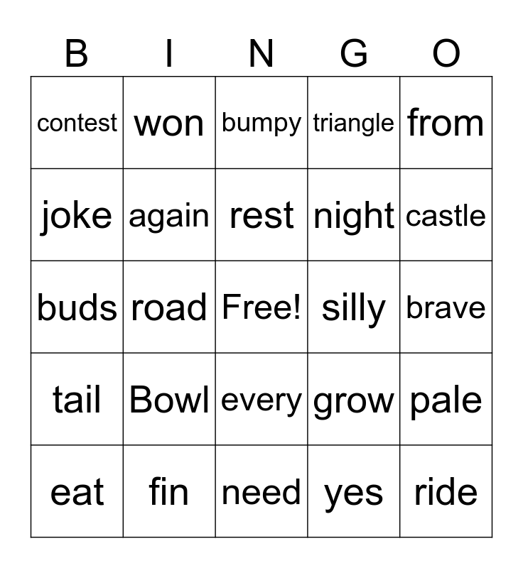 This bingo card has a free space and 25 words: Bowl, need, rest, eat, from, contest, joke, won, silly, every, night, buds, grow, pale, again, very, brave, bumpy, castle, road, ride, fin, tail, triangle and yes.