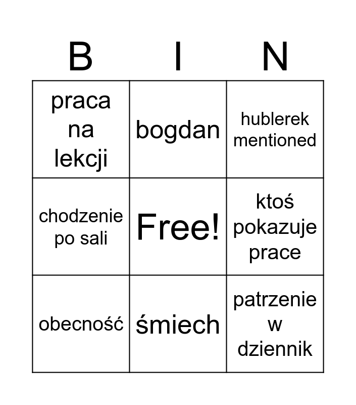 This bingo card has a free space and 10 words: śmiech, hublerek mentioned, praca na lekcji, patrzenie w dziennik, chodzenie po sali, obecność, bogdan, wyzwiska, ktoś pokazuje prace and >:(.
