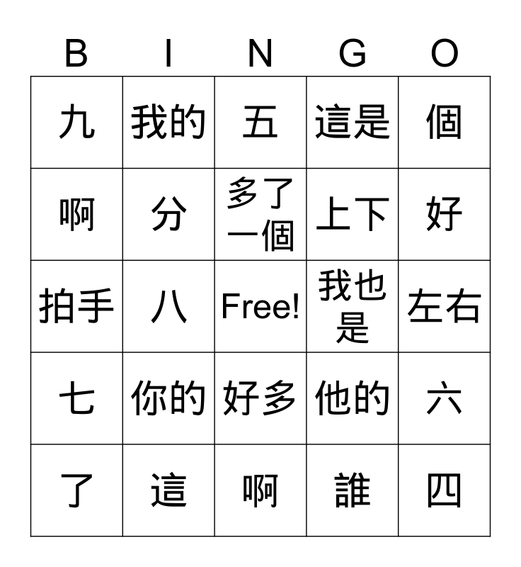 This bingo card has a free space and 24 words: 你的, 這, 多了一個, 了, 個, 九, 啊, 我的, 我也是, 好多, 上下, 拍手, 他的, 六, 分, 誰, 左右, 五, 好, 八, 四, 七, 這是 and 啊.