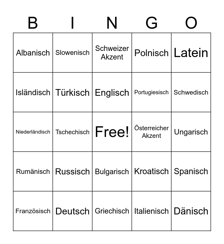 This bingo card has a free space and 24 words: Russisch, Deutsch, Englisch, Französisch, Latein, Albanisch, Isländisch, Slowenisch, Österreicher Akzent, Bulgarisch, Portugiesisch, Niederländisch, Kroatisch, Spanisch, Türkisch, Italienisch, Ungarisch, Schweizer Akzent, Schwedisch, Tschechisch, Dänisch, Rumänisch, Polnisch and Griechisch.