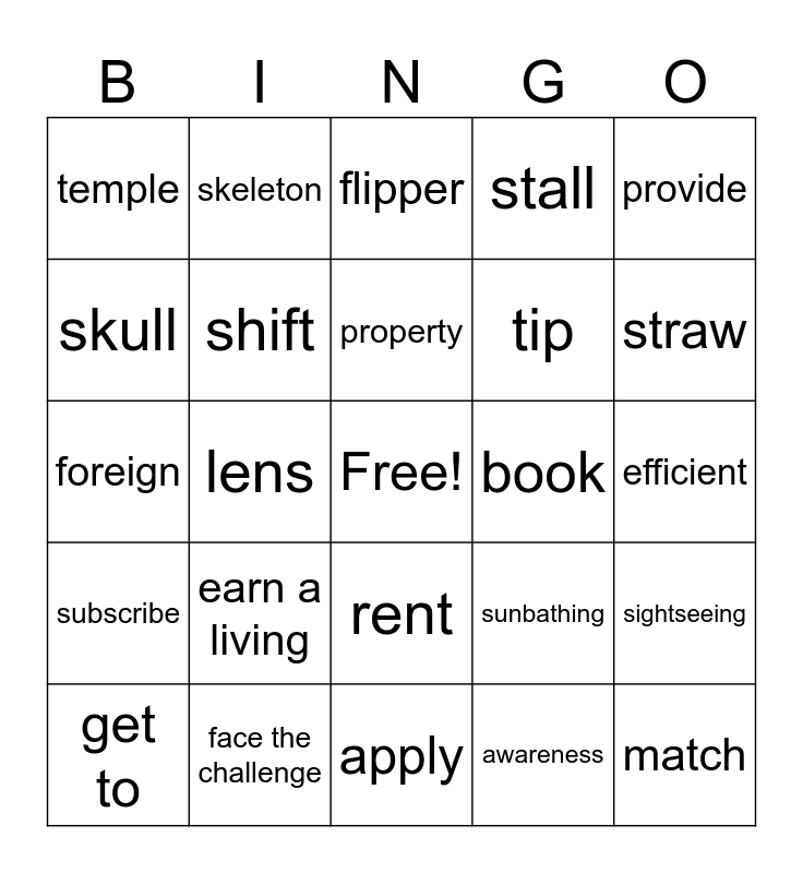 This bingo card has a free space and 24 words: earn a living, face the challenge, property, get to, provide, temple, skull, skeleton, book, rent, tip, foreign, sunbathing, sightseeing, shift, awareness, efficient, flipper, straw, lens, match, subscribe, stall and apply.