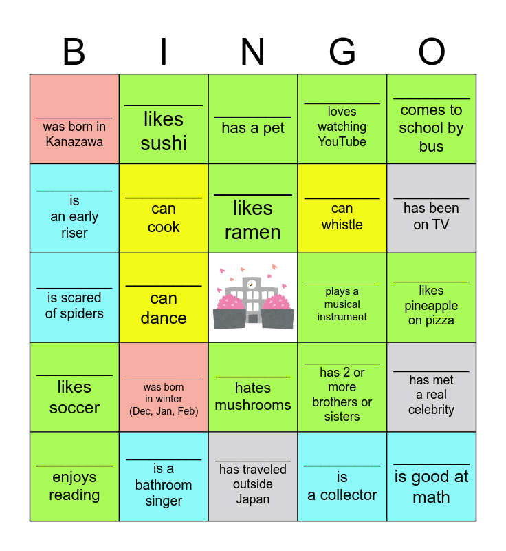 This bingo card has a free space and 24 words: ______________ was born in winter (Dec, Jan, Feb), __________ is a bathroom singer, _______ likes ramen, _________ enjoys reading, _________ comes to school by bus, ___________ was born in Kanazawa, __________ is an early riser, _______ likes sushi, ____________ plays a musical instrument, _________ hates mushrooms, __________ can whistle, __________ is scared of spiders, ___________ has 2 or more brothers or sisters, ___________ has met a real celebrity, _________ can cook, _________ is a collector, ___________ likes pineapple on pizza, _________ has a pet, __________ has been on TV, ________ can dance, ________ is good at math, ________ likes soccer, ___________ loves watching YouTube and ___________ has traveled outside Japan.