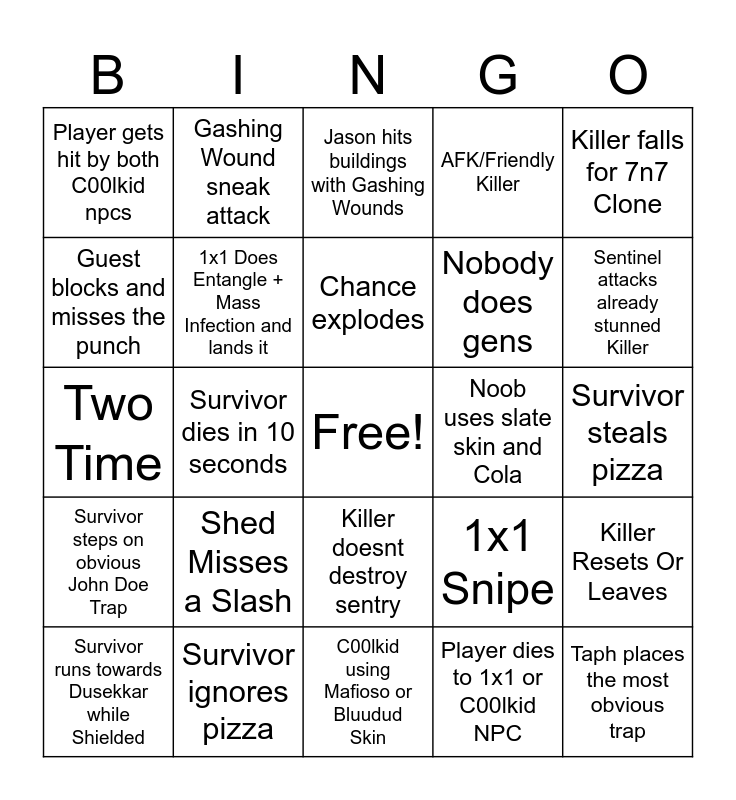 This bingo card has a free space and 24 words: Shed Misses a Slash, Survivor ignores pizza, Chance explodes, Survivor runs towards Dusekkar while Shielded, Killer falls for 7n7 Clone, Player gets hit by both C00lkid npcs, Guest blocks and misses the punch, Gashing Wound sneak attack, Noob uses slate skin and Cola, Killer doesnt destroy sentry, Nobody does gens, Two Time, 1x1 Snipe, Killer Resets Or Leaves, 1x1 Does Entangle + Mass Infection and lands it, Player dies to 1x1 or C00lkid NPC, Survivor steals pizza, Jason hits buildings with Gashing Wounds, Sentinel attacks already stunned Killer, Survivor dies in 10 seconds, Taph places the most obvious trap, Survivor steps on obvious John Doe Trap, AFK/Friendly Killer and C00lkid using Mafioso or Bluudud Skin.