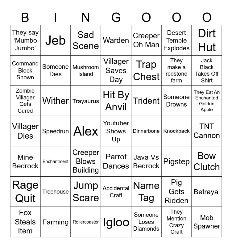 This bingo card has a free space and 60 words: Creative Mode, Villager Dies, Herobrine, Wither, Alex, Pig Gets Ridden, Dirt Hut, Wolf Tamed, Someone Dies, Betrayal, Warden, Jump Scare, Desert Temple Explodes, Creeper Blows Building, They Mention Crazy Craft, They say ‘Mumbo Jumbo’, They make a redstone farm, Creeper Oh Man, Musical Number, Command Block Shown, Jack Black Takes Off Shirt, Sad Scene, They Eat An Enchanted Golden Apple, Someone Drowns, Bed In Nether, Parrot Dances, Mine Bedrock, Don't Dig Straight Down, Mushroom Island, Pigstep, Charged Creeper, Treehouse, Someone Loses Diamonds, Pink Sheep, Jeb, Dinnerbone, Accidental Craft, Trap Chest, Java Vs Bedrock, Villager Saves Day, Name Tag, Trayaurus, Zombie Villager Gets Cured, Jason Mamoa Shakes Hair, Trident, TNT Cannon, Fox Steals Item, Rollercoaster, Igloo, Hit By Anvil, Speedrun, Secret Room, Rage Quit, Knockback, Enchantment, Bow Clutch, Farming, Elder Villager, Mob Spawner and Netherite.