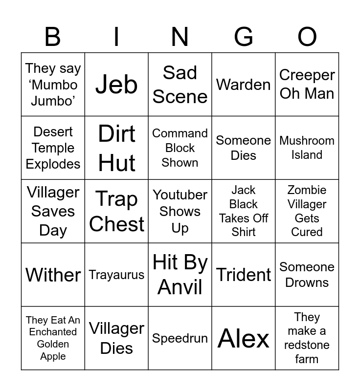 This bingo card has a free space and 60 words: Creative Mode, Villager Dies, Herobrine, Wither, Alex, Pig Gets Ridden, Dirt Hut, Wolf Tamed, Someone Dies, Betrayal, Warden, Jump Scare, Desert Temple Explodes, Creeper Blows Building, They Mention Crazy Craft, They say ‘Mumbo Jumbo’, They make a redstone farm, Creeper Oh Man, Musical Number, Command Block Shown, Jack Black Takes Off Shirt, Sad Scene, They Eat An Enchanted Golden Apple, Someone Drowns, Bed In Nether, Parrot Dances, Mine Bedrock, Don't Dig Straight Down, Mushroom Island, Pigstep, Charged Creeper, Treehouse, Someone Loses Diamonds, Pink Sheep, Jeb, Dinnerbone, Accidental Craft, Trap Chest, Java Vs Bedrock, Villager Saves Day, Name Tag, Trayaurus, Zombie Villager Gets Cured, Jason Mamoa Shakes Hair, Trident, TNT Cannon, Fox Steals Item, Rollercoaster, Igloo, Hit By Anvil, Speedrun, Secret Room, Rage Quit, Knockback, Enchantment, Bow Clutch, Farming, Elder Villager, Mob Spawner and Netherite.