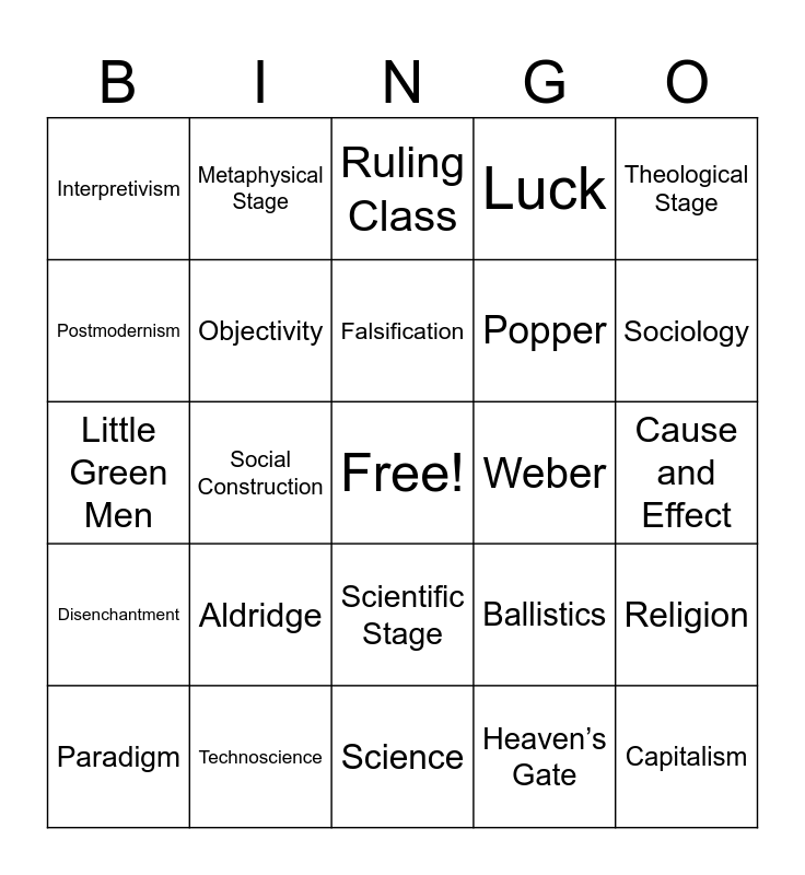 This bingo card has a free space and 25 words: Aldridge, Science, Falsification, Paradigm, Theological Stage, Interpretivism, Postmodernism, Metaphysical Stage, Weber, Scientific Stage, Popper, Little Green Men, Ballistics, Religion, Objectivity, Kuhn, Cause and Effect, Ruling Class, Sociology, Social Construction, Capitalism, Technoscience, Disenchantment, Luck and Heaven’s Gate.