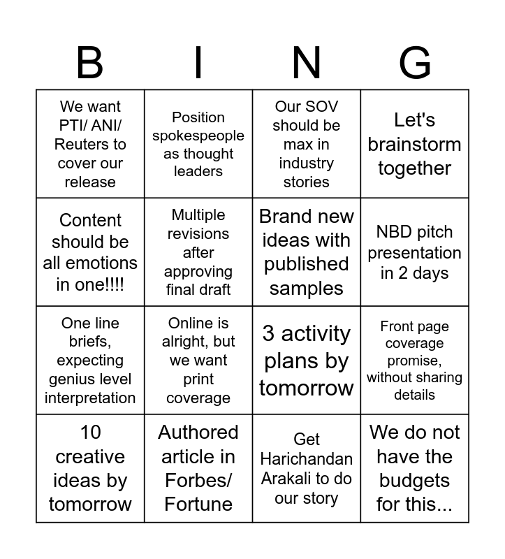 This bingo card has 16 words: Authored article in Forbes/ Fortune, Front page coverage promise, without sharing details, Our SOV should be max in industry stories, We want PTI/ ANI/ Reuters to cover our release, One line briefs, expecting genius level interpretation, Position spokespeople as thought leaders, 3 activity plans by tomorrow, Get Harichandan Arakali to do our story, Content should be all emotions in one!!!!, Multiple revisions after approving final draft, 10 creative ideas by tomorrow, Let's brainstorm together, Online is alright, but we want print coverage, NBD pitch presentation in 2 days, Brand new ideas with published samples and We do not have the budgets for this....