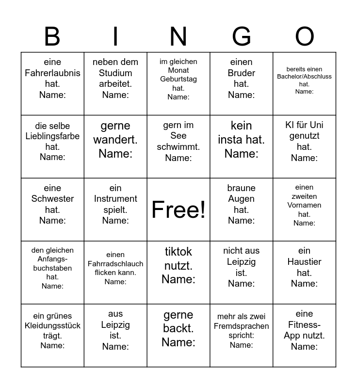 This bingo card has a free space and 24 words: einen Fahrradschlauch flicken kann. Name:, aus Leipzig ist. Name:, gern im See schwimmt. Name:, ein grünes Kleidungsstück trägt. Name:, bereits einen Bachelor/Abschluss hat. Name:, eine Fahrerlaubnis hat. Name:, die selbe Lieblingsfarbe hat. Name:, neben dem Studium arbeitet. Name:, braune Augen hat. Name:, tiktok nutzt. Name:, kein insta hat. Name:, eine Schwester hat. Name:, nicht aus Leipzig ist. Name:, ein Haustier hat. Name:, gerne wandert. Name:, mehr als zwei Fremdsprachen spricht: Name:, einen zweiten Vornamen hat. Name:, im gleichen Monat Geburtstag hat. Name:, KI für Uni genutzt hat. Name:, ein Instrument spielt. Name:, eine Fitness-App nutzt. Name:, den gleichen Anfangs-buchstaben hat. Name:, einen Bruder hat. Name: and gerne backt. Name:.