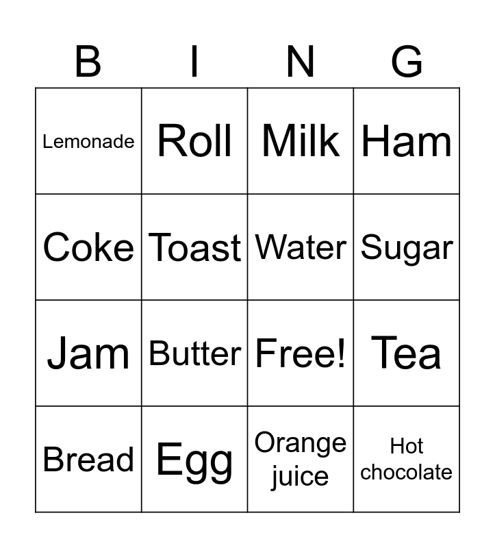 This bingo card has 19 words: Free!, Coffee, Milk, Hot chocolate, Tea, Coke, Orange juice, Lemonade, Roll, Jam, Butter, Toast, Water, Egg, Bread, Honey, Ham, Sugar and Cornflakes.