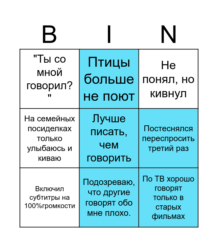 This bingo card has a free space and 8 words: Постеснялся переспросить третий раз, Не понял, но кивнул, Птицы больше не поют, Включил субтитры на 100%громкости, "Ты со мной говорил? ", По ТВ хорошо говорят только в старых фильмах, На семейных посиделках только улыбаюсь и киваю and Подозреваю, что другие говорят обо мне плохо..