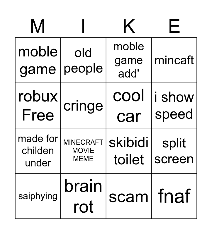 This bingo card has 16 words: brain rot, split screen, moble game add', moble game, made for childen under, old people, skibidi toilet, scam, robux Free, cringe, saiphying, mincaft, MINECRAFT MOVIE MEME, i show speed, cool car and fnaf.