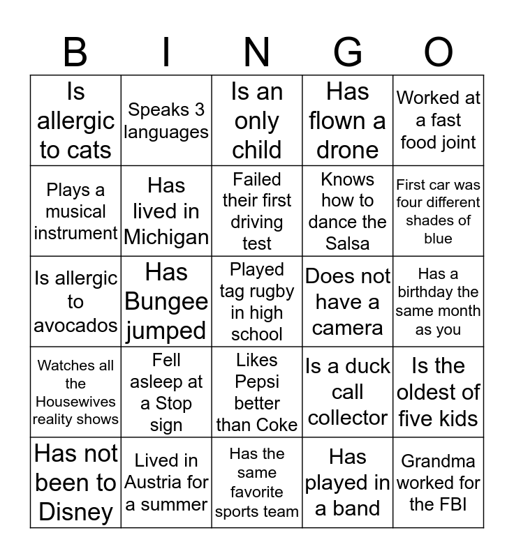 This bingo card has 25 words: Fell asleep at a Stop sign, Has the same favorite sports team, Failed their first driving test, Has not been to Disney, Worked at a fast food joint, Is allergic to cats, Plays a musical instrument, Speaks 3 languages, Does not have a camera, Likes Pepsi better than Coke, Knows how to dance the Salsa, Is allergic to avocados, Is a duck call collector, Is the oldest of five kids, Has lived in Michigan, Grandma worked for the FBI, Has a birthday the same month as you, Is an only child, First car was four different shades of blue, Has Bungee jumped, Played tag rugby in high school, Lived in Austria for a summer, Watches all the Housewives reality shows, Has flown a drone and Has played in a band.