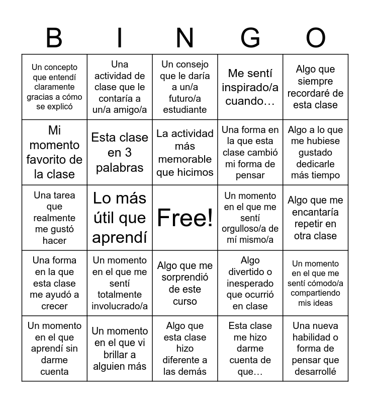 This bingo card has a free space and 25 words: Un momento en el que me sentí totalmente involucrado/a, Algo que esta clase hizo diferente a las demás, La actividad más memorable que hicimos, Un momento en el que aprendí sin darme cuenta, Algo que siempre recordaré de esta clase, Un concepto que entendí claramente gracias a cómo se explicó, Mi momento favorito de la clase, Una actividad de clase que le contaría a un/a amigo/a, Un momento en el que me sentí orgulloso/a de mí mismo/a, Algo que me sorprendió de este curso, Una forma en la que esta clase cambió mi forma de pensar, Una tarea que realmente me gustó hacer, Algo divertido o inesperado que ocurrió en clase, Un momento en el que me sentí cómodo/a compartiendo mis ideas, Esta clase en 3 palabras, Mi cita o frase favorita del curso, Algo que me encantaría repetir en otra clase, Un consejo que le daría a un/a futuro/a estudiante, Algo a lo que me hubiese gustado dedicarle más tiempo, Lo más útil que aprendí, Una nueva habilidad o forma de pensar que desarrollé, Un momento en el que vi brillar a alguien más, Una forma en la que esta clase me ayudó a crecer, Me sentí inspirado/a cuando… and Esta clase me hizo darme cuenta de que….