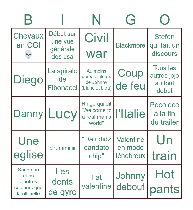 This bingo card has a free space and 24 words: "chumimiiiii", Les dents de gyro, Au moins deux couleurs de Johnny (blanc et bleu), Sandman dans d'autres couleurs que la officielle, Stefen qui fait un discours, Chevaux en CGI 💀, Diego, Début sur une vue générale des usa, l'Italie, "Dati didz dandato chip", Coup de feu, Danny, Valentine en mode ténébreux, Un train, La spirale de Fibonacci, Johnny debout, Pocoloco à la fin du trailer, Civil war, Tous les autres jojo au tout debut, Lucy, Hot pants, Une eglise, Blackmore and Fat valentine.