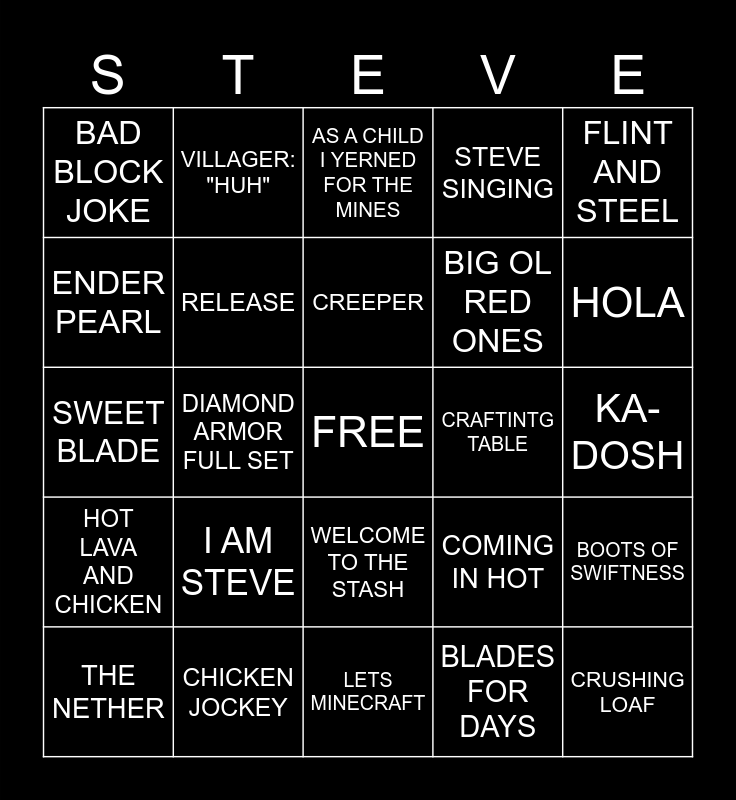 This bingo card has a free space and 24 words: I AM STEVE, CHICKEN JOCKEY, CREEPER, THE NETHER, FLINT AND STEEL, BAD BLOCK JOKE, ENDER PEARL, VILLAGER: "HUH", CRAFTINTG TABLE, WELCOME TO THE STASH, BIG OL RED ONES, SWEET BLADE, COMING IN HOT, BOOTS OF SWIFTNESS, RELEASE, BLADES FOR DAYS, KA-DOSH, AS A CHILD I YERNED FOR THE MINES, HOLA, DIAMOND ARMOR FULL SET, CRUSHING LOAF, HOT LAVA AND CHICKEN, STEVE SINGING and LETS MINECRAFT.