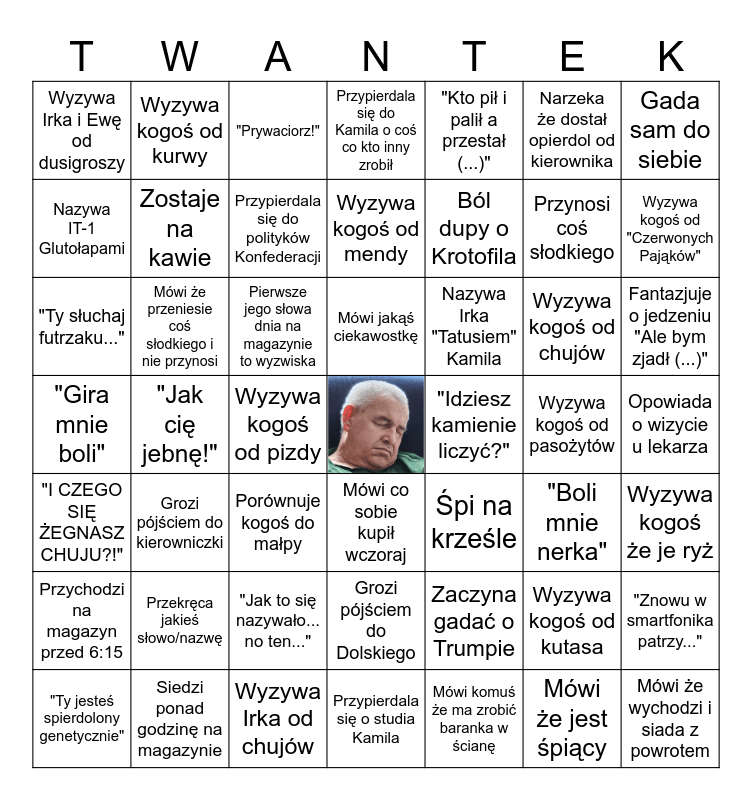 This bingo card has a free space and 69 words: "Dziś na śniadanie jadłem...", "Ty słuchaj futrzaku...", "Jesteś rozjebany jak (...)", "Boli mnie nerka", "Gira mnie boli", "No i co?", Przypierdala się do Kamila o coś co kto inny zrobił, "Znowu w smartfonika patrzy...", "Kto pił i palił a przestał (...)", Przypierdala się do Kamila że się nie rozmnaża, Wyzywa kogoś od chujów, Wyzywa Irka od chujów, Wyzywa Irka i Ewę od dusigroszy, "Prywaciorz!", Wydaje Choroszczańskie odgłosy, Ból dupy o Krotofila, Mówi jakąś ciekawostkę, Zostaje na kawie, Mówi że przyjdzie na kawę i nie przychodzi, Mówi że przeniesie coś słodkiego i nie przynosi, Wyzywa kogoś od "Czerwonych Pająków", Nazywa Irka "Tatusiem" Kamila, Przypierdala się do polityków Konfederacji, Wyzywa kogoś od pasożytów, Grozi pójściem do kierowniczki, Grozi pójściem do Dolskiego, Przekręca jakieś słowo/nazwę, "Jak to się nazywało... no ten...", Wyzywa kogoś od pizdy, Wyzywa kogoś od kutasa, Wyzywa kogoś od kurwy, Siedzi ponad godzinę na magazynie, Śpi na fotelu, Śpi, Śpi na krześle, Mówi co sobie kupił wczoraj, Przypierdala się o studia Kamila, "I CZEGO SIĘ ŻEGNASZ CHUJU?!", Narzeka że dostał opierdol od kierownika, Mówi że wychodzi i siada z powrotem, Pierwsze jego słowa dnia na magazynie to wyzwiska, Przynosi coś słodkiego, Opowiada o wizycie u lekarza, Nie przychodzi na magazyn, Jest na L4, Fantazjuje o jedzeniu "Ale bym zjadł (...)", Wyzywa kogoś że je ryż, Mówi komuś że ma zrobić baranka w ścianę, "Pinkowskie były?", Gada sam do siebie, Nazywa IT-1 Glutołapami, Narzeka że ktoś coś źle zrobił u niego na wydziale, Porównuje kogoś do małpy, "Jak cię jebnę!", Wyzywa Dawida że jest ojcem trójki dzieci a głupoty w głowie, Zaczyna gadać kiedy ktoś coś mówi, "Głupa rżniesz", "To jest tylko w twojej wybraźni", "Idziesz kamienie liczyć?", Wyzywa kogoś od mendy, Cmoka, "Idź do swojego kolegi (Krotofila)", "Ty jesteś spierdolony genetycznie", Przychodzi na magazyn przed 6:15, Zaczyna gadać o Trumpie, Zaczyna gadać o Musku, Mówi że jest śpiący, Przychodzi na magazyn po 12:00 and Mówi o tym co się na mieście buduje (sklep, kebab itp.).