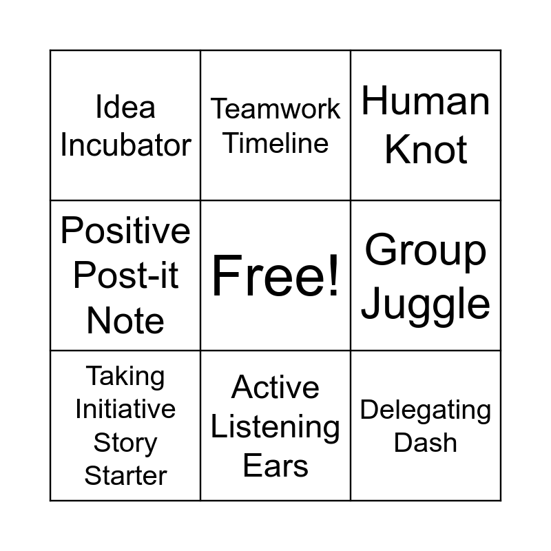 This bingo card has a free space and 11 words: Teamwork Tango, Active Listening Ears, Delegating Dash, Taking Initiative Story Starter, Teamwork Timeline, Human Knot, Group Juggle, Code Breaker, Positive Post-it Note, Idea Incubator and Leading by Example Freeze Dance.