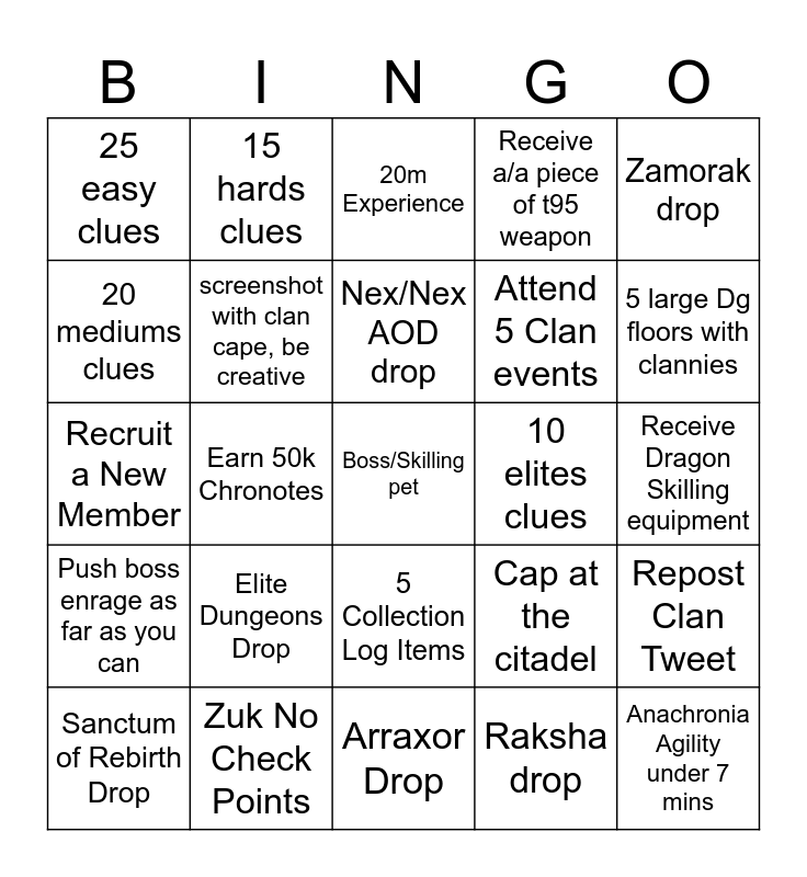 This bingo card has 25 words: Elite Dungeons Drop, Arraxor Drop, Nex/Nex AOD drop, Sanctum of Rebirth Drop, Zamorak drop, 25 easy clues, 20 mediums clues, 15 hards clues, 10 elites clues, 5 Collection Log Items, Attend 5 Clan events, Recruit a New Member, Cap at the citadel, Repost Clan Tweet, screenshot with clan cape, be creative, Anachronia Agility under 7 mins, Receive Dragon Skilling equipment, 20m Experience, 5 large Dg floors with clannies, Earn 50k Chronotes, Boss/Skilling pet, Zuk No Check Points, Push boss enrage as far as you can, Receive a/a piece of t95 weapon and Raksha drop.