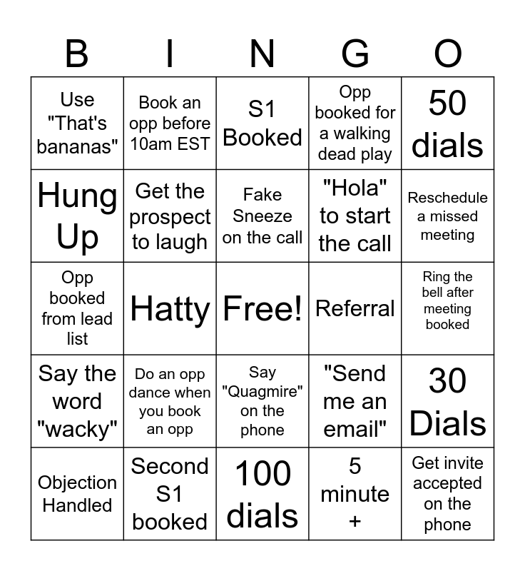 This bingo card has a free space and 24 words: Do an opp dance when you book an opp, Second S1 booked, Fake Sneeze on the call, Objection Handled, 50 dials, Use "That's bananas", Hung Up, Book an opp before 10am EST, Referral, Say "Quagmire" on the phone, "Hola" to start the call, Opp booked from lead list, "Send me an email", 30 Dials, Get the prospect to laugh, 5 minute +, Ring the bell after meeting booked, S1 Booked, Reschedule a missed meeting, Hatty, Get invite accepted on the phone, Say the word "wacky", Opp booked for a walking dead play and 100 dials.