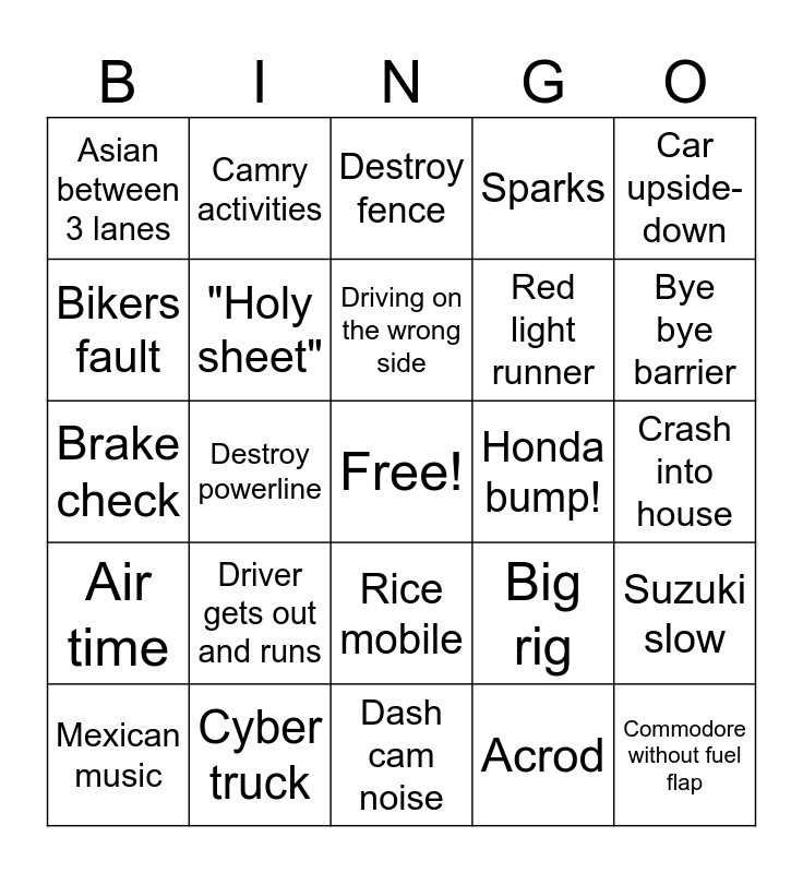 This bingo card has a free space and 24 words: Driver gets out and runs, Cyber truck, Driving on the wrong side, Mexican music, Car upside-down, Asian between 3 lanes, Bikers fault, Camry activities, Honda bump!, Rice mobile, Red light runner, Brake check, Big rig, Suzuki slow, "Holy sheet", Acrod, Crash into house, Destroy fence, Bye bye barrier, Destroy powerline, Commodore without fuel flap, Air time, Sparks and Dash cam noise.