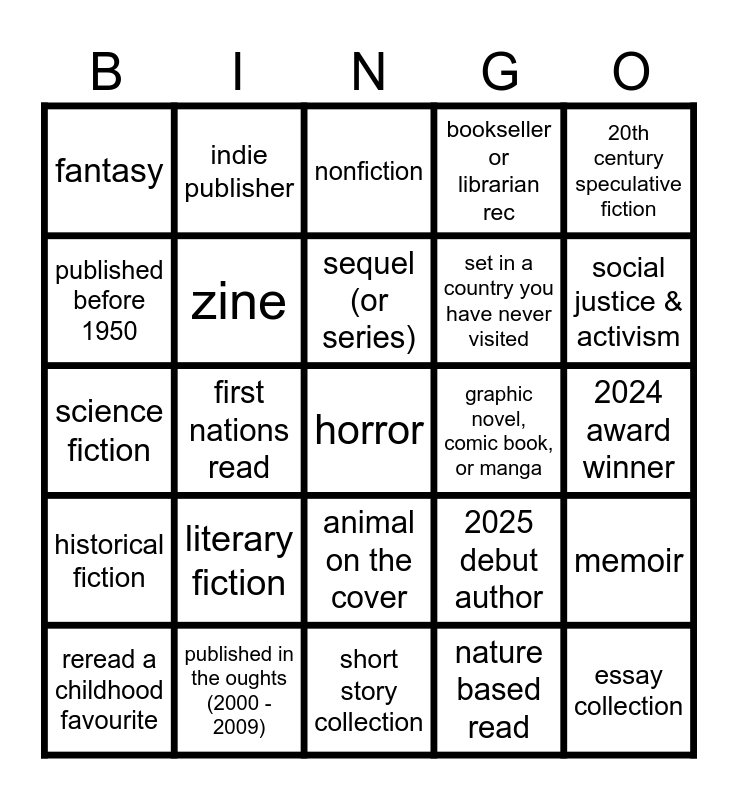 This bingo card has 25 words: literary fiction, short story collection, sequel (or series), reread a childhood favourite, 20th century speculative fiction, fantasy, published before 1950, indie publisher, graphic novel, comic book, or manga, animal on the cover, set in a country you have never visited, science fiction, 2025 debut author, memoir, zine, essay collection, 2024 award winner, nonfiction, social justice & activism, first nations read, horror, published in the oughts (2000 - 2009), historical fiction, bookseller or librarian rec and nature based read.