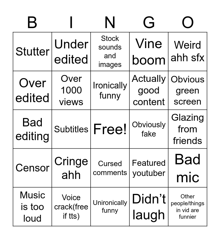 This bingo card has a free space and 25 words: Cringe ahh, Unironically funny, Ironically funny, Music is too loud, Weird ahh sfx, Stutter, Over edited, Under edited, Obviously fake, Cursed comments, Actually good content, Bad editing, Featured youtuber, Bad mic, Over 1000 views, Over 100 likes, Glazing from friends, Stock sounds and images, Obvious green screen, Subtitles, Other people/things in vid are funnier, Voice crack(free if tts), Censor, Vine boom and Didn’t laugh.