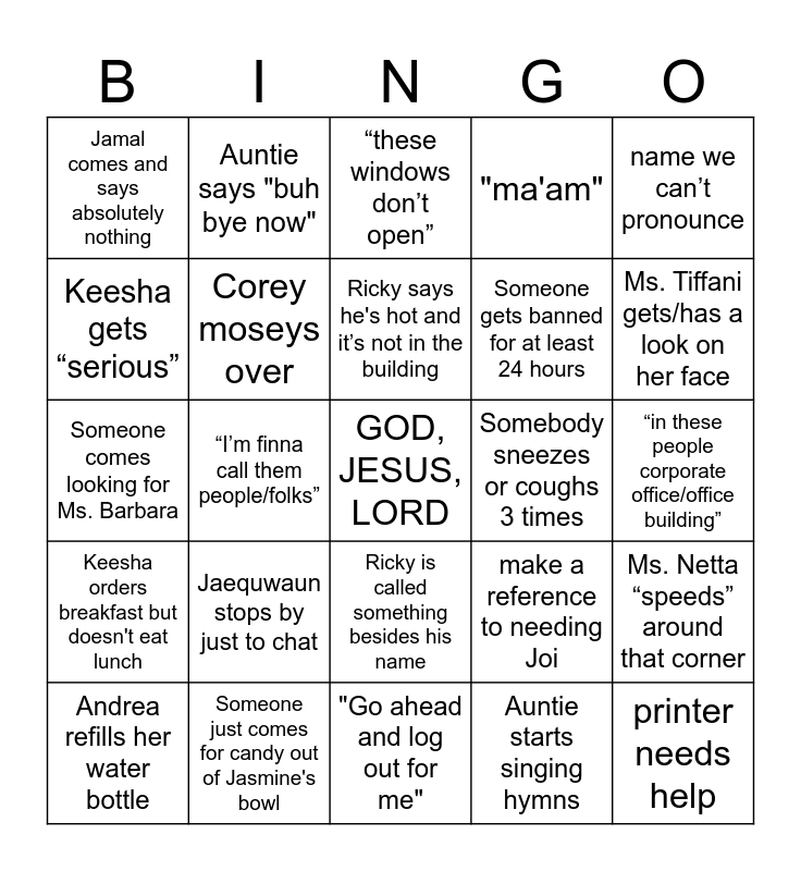This bingo card has a free space and 28 words: Ms. Netta “speeds” around that corner, Jasmine’s cousin comes to visit, Someone gets banned for at least 24 hours, Auntie starts singing hymns, Keesha gets “serious”, “these windows don’t open”, Auntie says "buh bye now", Keesha orders breakfast but doesn't eat lunch, Somebody sneezes or coughs 3 times, Andrea refills her water bottle, Someone comes looking for Ms. Barbara, "ma'am", Someone just comes for candy out of Jasmine's bowl, "Go ahead and log out for me", Ms. Tiffani gets/has a look on her face, Reconnect goes down, Jaequwaun stops by just to chat, Corey moseys over, Ricky says he's hot and it’s not in the building, Ricky is called something besides his name, Jamal comes and says absolutely nothing, "swerve in that corner woah", printer needs help, “I’m finna call them people/folks”, “in these people corporate office/office building”, make a reference to needing Joi, name we can’t pronounce and “Go sit down”.