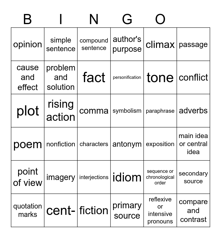 This bingo card has 53 words: theme, plot, setting, main idea or central idea, paraphrase, reflexive or intensive pronouns, simple sentence, summary, passage, compare and contrast, cause and effect, fiction, nonfiction, poem, connotation, characters, problem and solution, rising action, realistic fiction, climax, conflict, point of view, fact, opinion, synonym, antonym, sequence or chronological order, metaphor, idiom, personification, sub-, cent-, evidence, RACE, primary source, secondary source, author's purpose, exposition, compound sentence, subordinating conjunctions, claim, apostrophe, comma, adjectives, prepositional phrases, adverbs, interjections, quotation marks, tone, symbolism, hyperbole, imagery and I, me, my, mine, we.