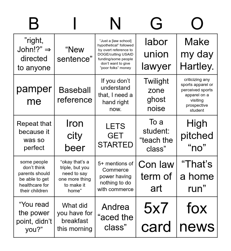 This bingo card has a free space and 37 words: Same jokes every year, you guys gotta give me a laugh, Can’t make this up, Baseball reference, “That’s a home run”, “okay that’s a triple, but you need to say one more thing to make it home”, If you don’t understand that, I need a hand right now., “You guys can’t hide the ball on me”, Make my day Hartley., Vague anatomical reference to a “larnix”, Iron city beer, labor union lawyer, fox news, High pitched “no”, pamper me, some people don’t think parents should be able to get healthcare for their children, Conditioning wetlands funding on rounding up illegal immigrants, “Just a [law school] hypothetical” followed by overt reference to DOGE/cutting USAID funding/some people don’t want to give “poor folks” money, 5+ mentions of Commerce power having nothing to do with commerce, To a student: “teach the class”, ”right, John!?” ⇒ directed to anyone, criticizing any sports apparel or perceived sports apparel on a visiting prospective student, “You read the power point, didn’t you?”, Andrea “aced the class”, “Wrong answers”, 5x7 card, “New sentence”, Wednesdee, perches on the desk on the far side with his legs crossed, Having trouble hearing you / Speak louder, Roger wears khaki pants, What did you have for breakfast this morning, Repeat that because it was so perfect, “Dibs”, Con law term of art, Twilight zone ghost noise and “Louder so everybody can hear”.