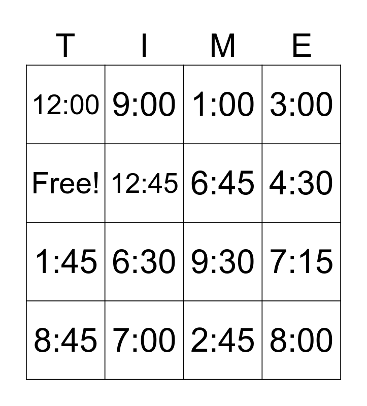 This bingo card has 16 words: 7:00, 7:15, 1:00, 12:00, 1:45, 9:00, 9:30, 2:45, Free!, 12:45, 8:45, 3:00, 6:30, 4:30, 6:45 and 8:00.
