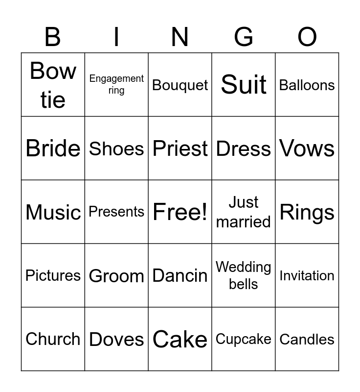 This bingo card has a free space and 24 words: Church, Groom, Priest, Cupcake, Balloons, Bow tie, Engagement ring, Bouquet, Just married, Rings, Music, Shoes, Wedding bells, Invitation, Bride, Doves, Cake, Suit, Vows, Pictures, Presents, Dancin, Dress and Candles.