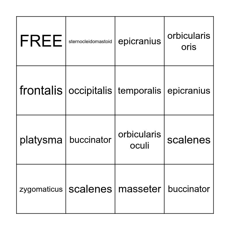 This bingo card has 21 words: platysma, orbicularis oculi, temporalis, buccinator, zygomaticus, sternocleidomastoid, epicranius, orbicularis oris, FREE, occipitalis, splenius capitis, epicranius, frontalis, scalenes, masseter, semispinalis capitis, frontalis, buccinator, orbicularis oculi, scalenes and occipitalis.