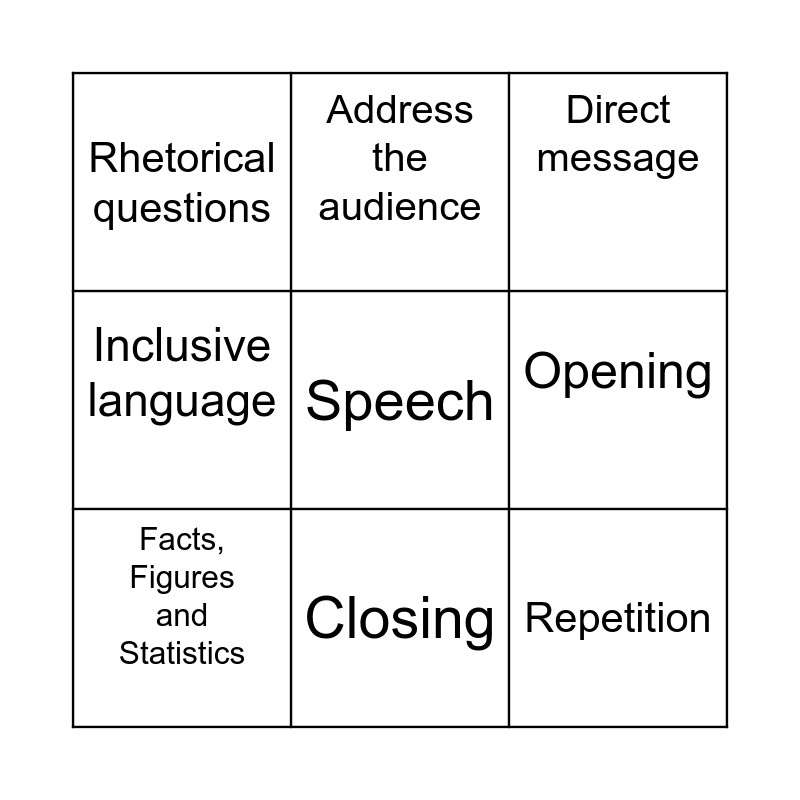 This bingo card has a free space and 8 words: Opening, Direct message, Address the audience, Facts, Figures and Statistics, Rhetorical questions, Repetition, Inclusive language and Closing.