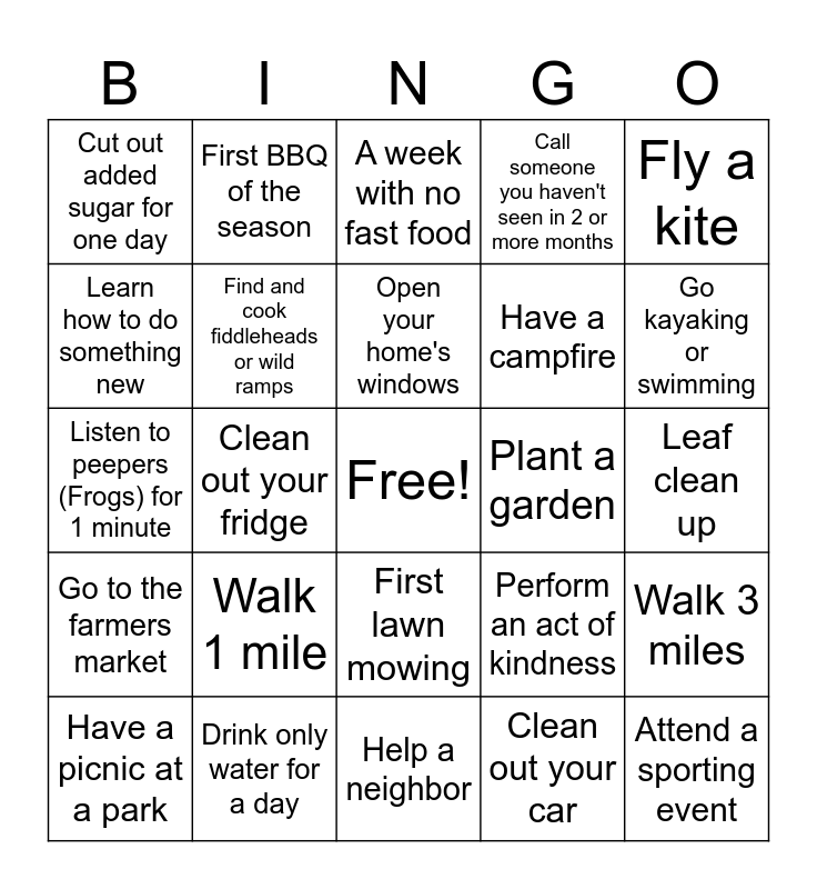 This bingo card has a free space and 34 words: Find a lady bug or butterfly, Clean out your car, Pick some tulips or daffodils, Ride a bike for 20 minutes, Go to the farmers market, Find and cook fiddleheads or wild ramps, Fly a kite, Have a picnic at a park, First BBQ of the season, Walk 2 miles, Open your home's windows, A week with no fast food, Do yoga for 30 minutes, Participate in Green-Up Day, Plant a garden, Go kayaking or swimming, Drink only water for a day, Listen to peepers (Frogs) for 1 minute, Walk 1 mile, Perform an act of kindness, First lawn mowing, Take a walk during your lunch break, Cut out added sugar for one day, Leaf clean up, Help a neighbor, Attend a sporting event, Call someone you haven't seen in 2 or more months, Mail a Birthday card, Have a campfire, Learn how to do something new, Read a book, Clean out your fridge, Walk 3 miles and Do an arts and craft project.