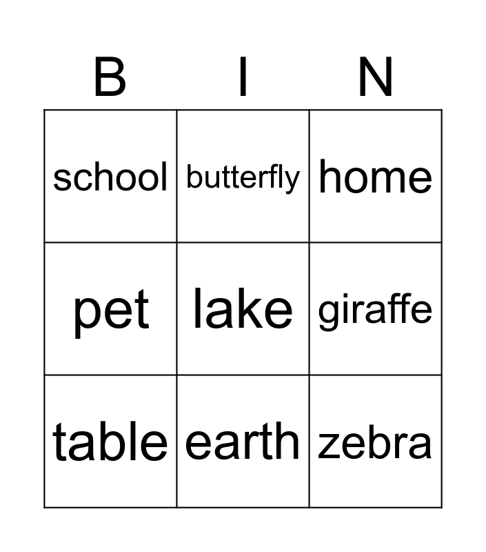 This bingo card has 31 words: Free!, girl, boy, friend, school, home, table, book, pencil, eraser, short, long, early, late, square, triangle, light, dark, farm, zoo, lake, flower, bee, butterfly, zebra, giraffe, pet, animal, nature, earth and planet.