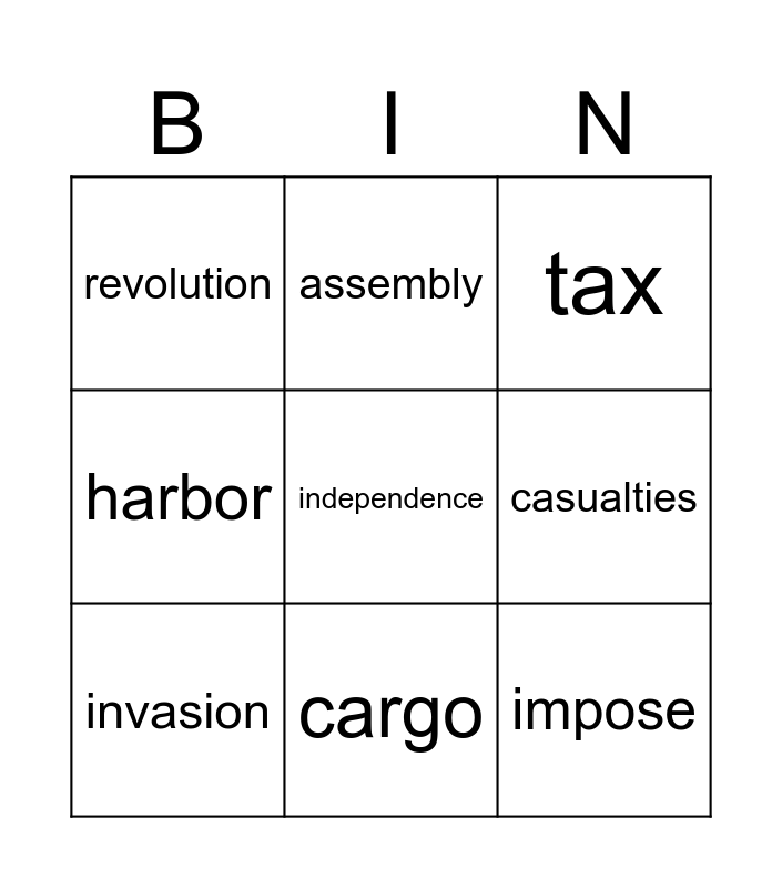 This bingo card has 9 words: invasion, tax, assembly, harbor, revolution, casualties, independence, impose and cargo.