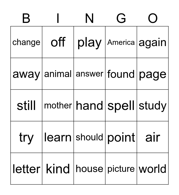 This bingo card has 25 words: try, kind, hand, picture, again, change, off, play, spell, air, away, animal, house, point, page, letter, mother, answer, found, study, still, learn, should, America and world.