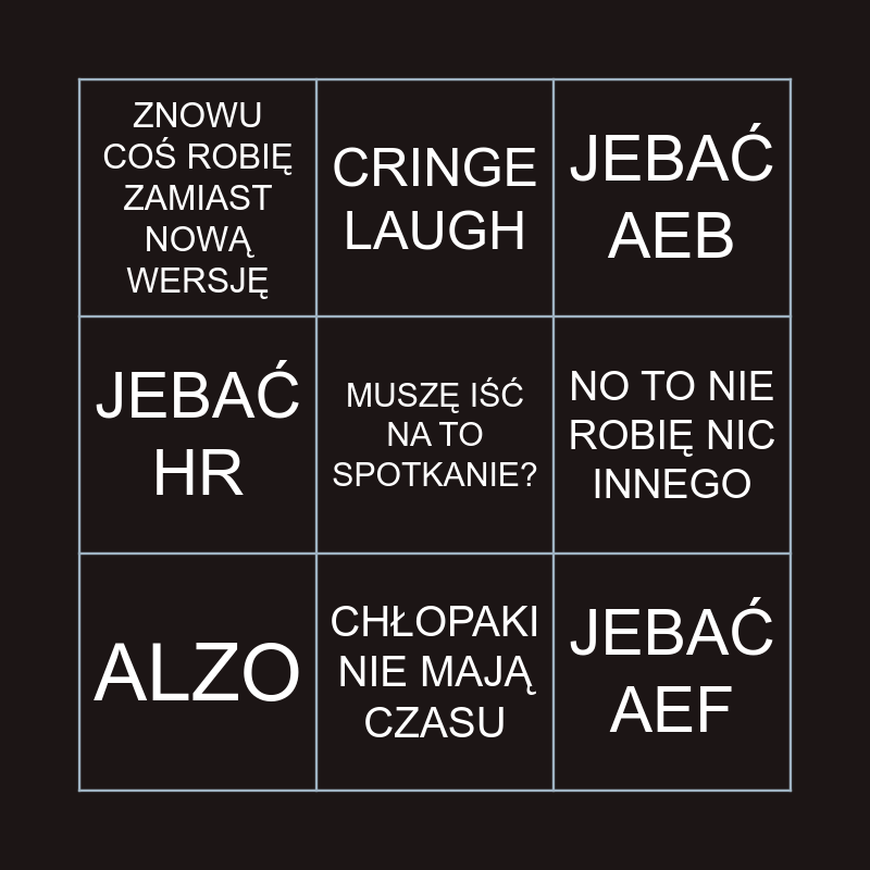 This bingo card has 9 words: ALZO, MUSZĘ IŚĆ NA TO SPOTKANIE?, JEBAĆ AEB, ZNOWU COŚ ROBIĘ ZAMIAST NOWĄ WERSJĘ, CRINGE LAUGH, NO TO NIE ROBIĘ NIC INNEGO, JEBAĆ HR, CHŁOPAKI NIE MAJĄ CZASU and JEBAĆ AEF.
