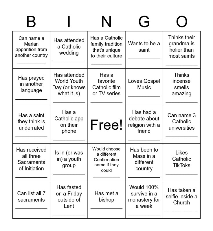This bingo card has a free space and 29 words: Can list all 7 sacraments ___________, Can name 3 titles for Mary ___________, Has a Catholic app on their phone ___________, Knows the name of the Pope before Francis ___________, Can name a Marian apparition from another country ___________, Has a Catholic family tradition that's unique to their culture ___________, Has attended World Youth Day (or knows what it is) ___________, Is in (or was in) a youth group ___________, Has had a debate about religion with a friend ___________, Has fasted on a Friday outside of Lent ___________, Can name 3 Catholic universities ___________, Has taken a selfie inside a Church ___________, Has met a bishop ___________, Would 100% survive in a monastery for a week ___________, Thinks incense smells amazing ___________, Has cried during a Church service/homily ___________, Would choose a different Confirmation name if they could ___________, Has received all three Sacraments of Initiation ___________, Thinks their grandma is holier than most saints ___________, Has a saint they think is underrated ___________, Has been to Mass in a different country ___________, Has attended a Spanish Mass ___________, Loves Gospel Music ___________, Has prayed in another language ___________, Wants to be a saint ___________, Has attended a Catholic wedding ___________, Likes Catholic TikToks ___________, Has a favorite Catholic film or TV series ___________ and Can recite at least three Bible verses from memory ___________.