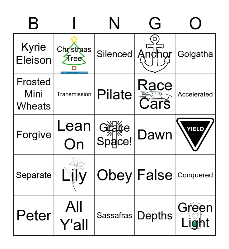 This bingo card has 6 images, a free space and 23 words: Lily, All Y'all, Pilate, Peter, Golgatha, Kyrie Eleison, Frosted Mini Wheats, Christmas Tree, Dawn, Obey, Race Cars, Forgive, False, Conquered, Transmission, Depths, Silenced, Accelerated, Lean On, Green Light, Separate, Anchor and Sassafras.