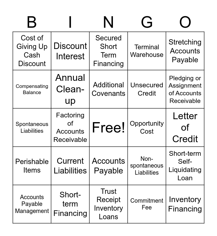 This bingo card has a free space and 24 words: Current Liabilities, Short-term Financing, Additional Covenants, Accounts Payable Management, Stretching Accounts Payable, Cost of Giving Up Cash Discount, Compensating Balance, Discount Interest, Opportunity Cost, Accounts Payable, Unsecured Credit, Spontaneous Liabilities, Non-spontaneous Liabilities, Short-term Self-Liquidating Loan, Annual Clean-up, Commitment Fee, Letter of Credit, Secured Short Term Financing, Pledging or Assignment of Accounts Receivable, Factoring of Accounts Receivable, Inventory Financing, Perishable Items, Terminal Warehouse and Trust Receipt Inventory Loans.