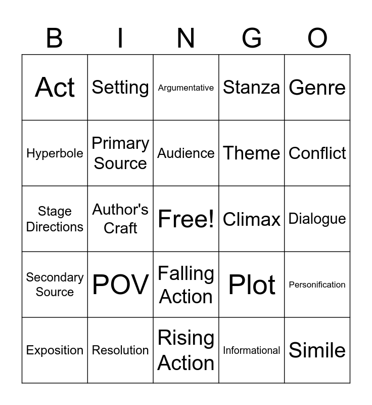 This bingo card has a free space and 24 words: POV, Resolution, Audience, Exposition, Genre, Act, Hyperbole, Setting, Climax, Falling Action, Theme, Stage Directions, Plot, Personification, Primary Source, Informational, Dialogue, Argumentative, Conflict, Author's Craft, Simile, Secondary Source, Stanza and Rising Action.