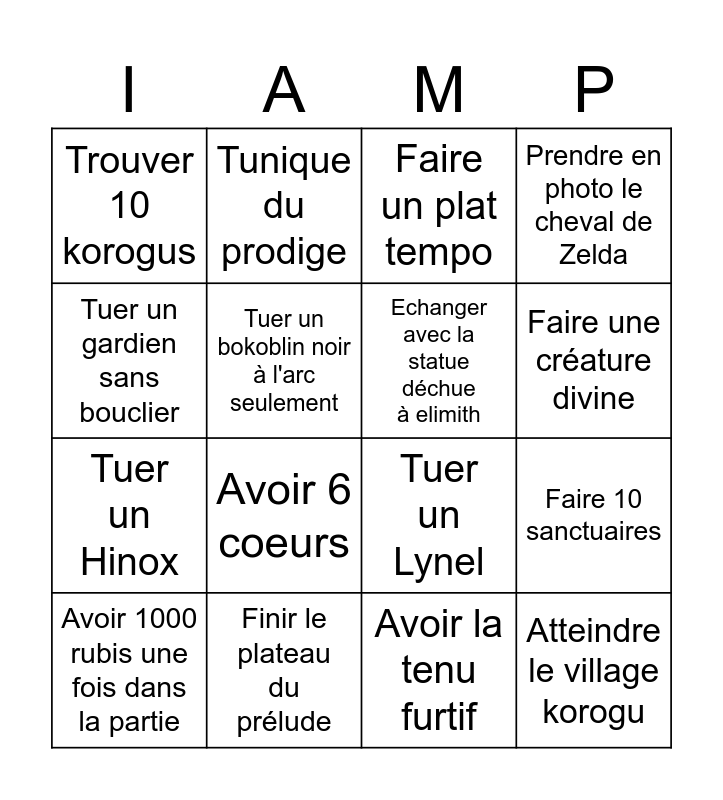 This bingo card has 16 words: Finir le plateau du prélude, Faire 10 sanctuaires, Faire un plat tempo, Trouver 10 korogus, Tuer un Hinox, Tunique du prodige, Tuer un Lynel, Avoir la tenu furtif, Tuer un gardien sans bouclier, Tuer un bokoblin noir à l'arc seulement, Avoir 1000 rubis une fois dans la partie, Prendre en photo le cheval de Zelda, Avoir 6 coeurs, Faire une créature divine, Echanger avec la statue déchue à elimith and Atteindre le village korogu.