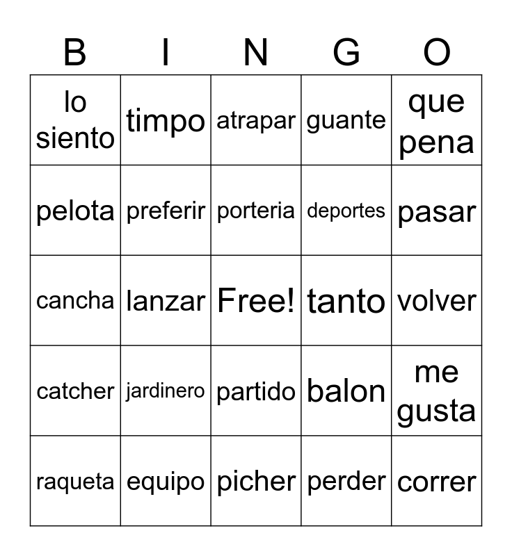 This bingo card has a free space and 24 words: jardinero, equipo, porteria, raqueta, que pena, lo siento, pelota, timpo, tanto, partido, deportes, cancha, balon, me gusta, preferir, perder, volver, atrapar, pasar, lanzar, correr, catcher, guante and picher.
