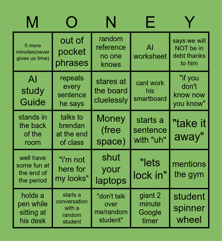 This bingo card has a free space and 35 words: only calls on Brendan and kengo, Sits on his desk, says "uh" after every word, repeats every sentence he says, shut your laptops, AI worksheet, AI study Guide, live presentation with 1-2 students, stares at the board cluelessly, makes whole class stand up for an activity, stands in the back of the room, says we will NOT be in debt thanks to him, "alright folks", freezes the smart board more than 6 times, 5 more minutes(never gives us time), starts a sentence with "uh", giant 2 minute Google timer, talks to brendan at the end of class, well have some fun at the end of the period, student spinner wheel, "lets lock in", holds a pen while sitting at his desk, mentions the gym, starts a conversation with a random student, random reference no one knows, "if you don't know now you know", strokes bald head, not watching the show on a friday, cant work his smartboard, "take it away", "we have some controversy here", "don't talk over me/random student", "i'm not here for my looks", out of pocket phrases and talks to random teacher in the hallway.