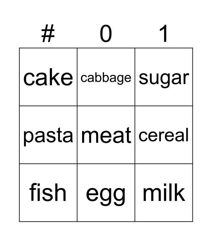 This bingo card has a free space and 8 words: cereal, sugar, cabbage, fish, cake, milk, pasta and egg.