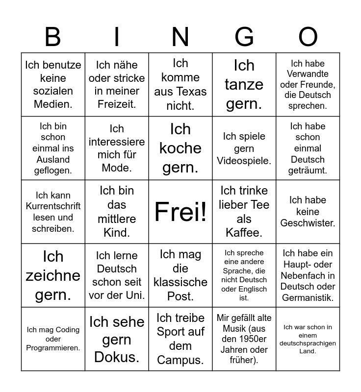 This bingo card has a free space and 44 words: Ich spiele ein Instrument., Ich war schon in einem deutschsprachigen Land., Ich schaue gern Sport an., Ich mag Coding oder Programmieren., Ich schreibe kreativ in meiner Freizeit., Mir gefällt alte Musik (aus den 1950er Jahren oder früher)., Ich komme aus Texas nicht., Ich bin ein/e Frühaufsteher/in., Ich habe Verwandte oder Freunde, die Deutsch sprechen., Ich sehe gern Dokus., Ich tanze gern., Ich trinke lieber Tee als Kaffee., Ich mag die klassische Post., Ich lerne Deutsch schon seit vor der Uni., Ich sammle etwas Interessantes., Ich treibe Sport auf dem Campus., Ich übe Deutsch online (z. B. beim Duolingo oder Busuu)., Ich kann Kurrentschrift lesen und schreiben., Ich habe aus Versehen Deutsch in einem Englisch-Gespräch benutzt., Ich habe schon einmal Deutsch geträumt., Ich nähe oder stricke in meiner Freizeit., Ich fotografiere gern., Ich lerne gern Geschichte., Ich benutze keine sozialen Medien., Ich habe (oder hatte) ein Haustier, das kein Hund und keine Katze ist., Ich habe keine Geschwister., Ich lese gern klassische Literatur., Ich gehe gerne wandern., Ich spreche eine andere Sprache, die nicht Deutsch oder Englisch ist., Ich zeichne gern., Ich kann mit beiden Händen schreiben., Ich habe ein Haupt- oder Nebenfach in Deutsch oder Germanistik., Ich kann Pi auf mehr als 5 Stellen aufsagen., Ich bin das jüngste Kind., Ich bin das mittlere Kind., Ich bin das älteste Kind., Ich bin ein Einzelkind., Ich lerne gern Mathematik., Ich koche gern., Ich bin schon einmal ins Ausland geflogen., Ich spiele gern Videospiele., Ich kann Schach spielen., Ich interessiere mich für Mode. and Ich habe schon mal einen Film auf Deutsch angeschaut..