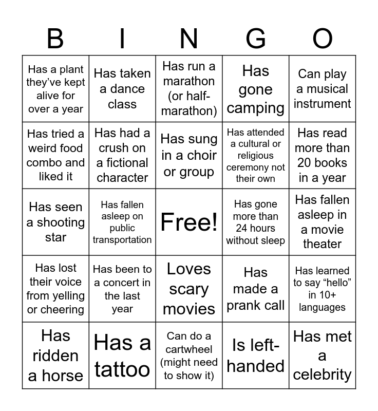 This bingo card has a free space and 43 words: Speaks more than two languages, Has met a celebrity, Has broken a bone, Has ridden a horse, Has dyed their hair a wild color, Is left-handed, Has run a marathon (or half-marathon), Is an only child, Can play a musical instrument, Has a tattoo, Has gone camping, Has gone more than 24 hours without sleep, Loves scary movies, Has been to a concert in the last year, Can drive a stick shift, Can do a cartwheel (might need to show it), Has been in a play or musical, Has seen a shooting star, Knows how to knit or crochet, Has read more than 20 books in a year, Has taken a dance class, Has done volunteer work, Has been in a long-distance relationship, Has a plant they’ve kept alive for over a year, Has a playlist for every mood, Has fallen asleep in a movie theater, Can name at least 5 Pokémon, Has dyed someone else’s hair, Has made a prank call, Has lost their voice from yelling or cheering, Has done a trust fall, Has learned to say “hello” in 10+ languages, Has had a pet other than a cat or dog, Has fallen asleep on public transportation, Has forgotten someone’s name right after meeting them, Has used a fake name at a coffee shop, Has been to a museum this year, Has sung in a choir or group, Has tried a weird food combo and liked it, Has attended a cultural or religious ceremony not their own, Has sent a text to the wrong person, Has had a crush on a fictional character and Has made a wish on a dandelion.