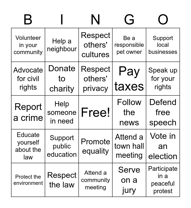 This bingo card has a free space and 25 words: Support public education, Attend a community meeting, Respect others' privacy, Protect the environment, Support local businesses, Volunteer in your community, Advocate for civil rights, Help a neighbour, Follow the news, Promote equality, Pay taxes, Report a crime, Attend a town hall meeting, Vote in an election, Donate to charity, Obey traffic laws, Defend free speech, Respect others' cultures, Speak up for your rights, Help someone in need, Participate in a peaceful protest, Respect the law, Educate yourself about the law, Be a responsible pet owner and Serve on a jury.