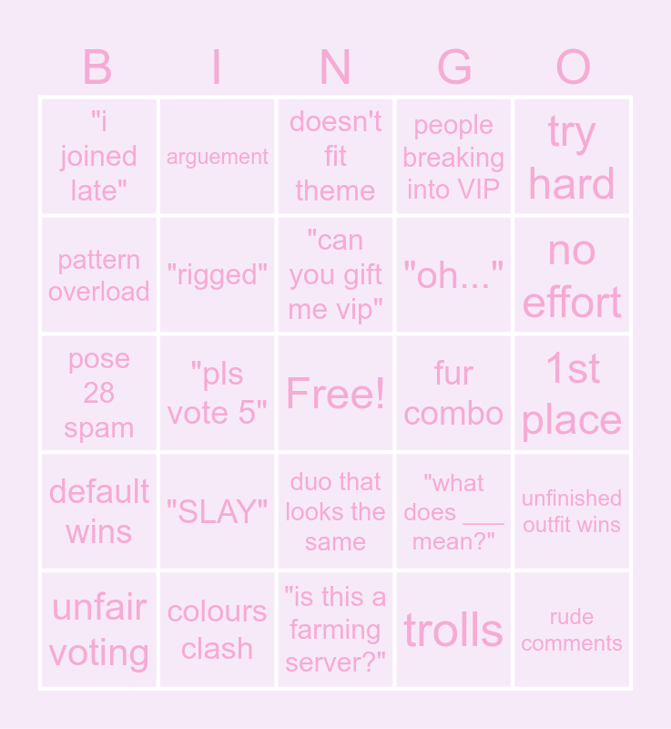 This bingo card has a free space and 24 words: unfair voting, "SLAY", "can you gift me vip", trolls, try hard, "i joined late", arguement, doesn't fit theme, fur combo, 1st place, pose 28 spam, "rigged", "what does ___ mean?", unfinished outfit wins, pattern overload, colours clash, "is this a farming server?", people breaking into VIP, no effort, default wins, "pls vote 5", duo that looks the same, "oh..." and rude comments.